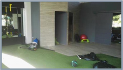 Installation of flooring, stone and moldings, erection of walls, construction of planters, fountains and application of